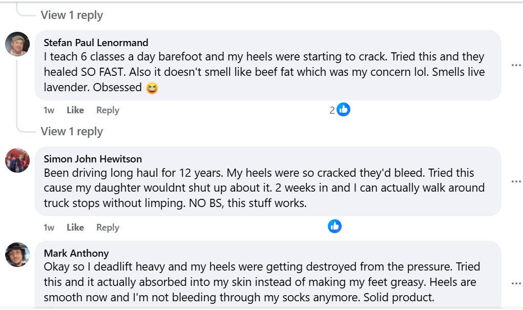 Tallow’s fatty acids match human skin’s natural lipids, so your body actually recognizes it and pulls it deep into the cracks.